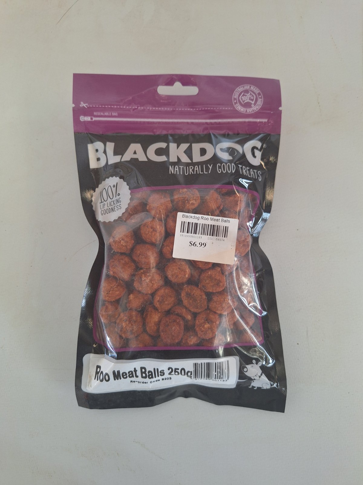 Blackdog Roo Meat Balls are small and soft chewy balls of high protein, low fat kangaroo meat that has been combined with a few other select ingredients. Ideal as a simple great tasting treat or as a training reward.Â