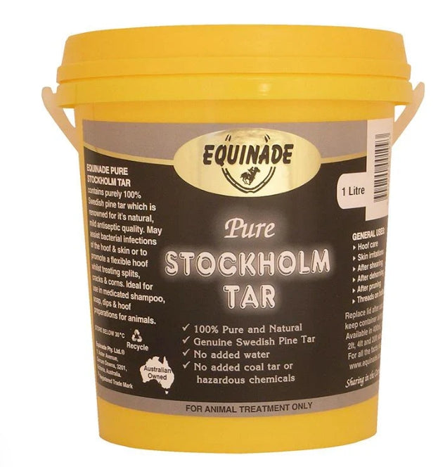 Equinade Stockholm Tar has been formulated from 100% Swedish pine tar to assist in the treatment of split hooves, split heels, cracks and corns. This non-toxic preparation does not contain water, petroleum based chemicals or carcinogenic creosote, and may also help to combat bacterial infections of the hoof and skin.