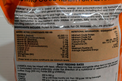 Livamol is a palatable blend of proteins. energy and polyunsaturated oils formulated to improve coat condition and general appearance of all stock, including stud and show animals. Selected omega-3 fatty acids and high oil protein meals improve coat and skin appearance.Coat colour may be affected by dietary levels of minerals such as zinc, copper and iron. Livamol has been formulated to supplement daily intakes of protein, fatty acids,vitamins and minerals including calcuim and phosphorus.